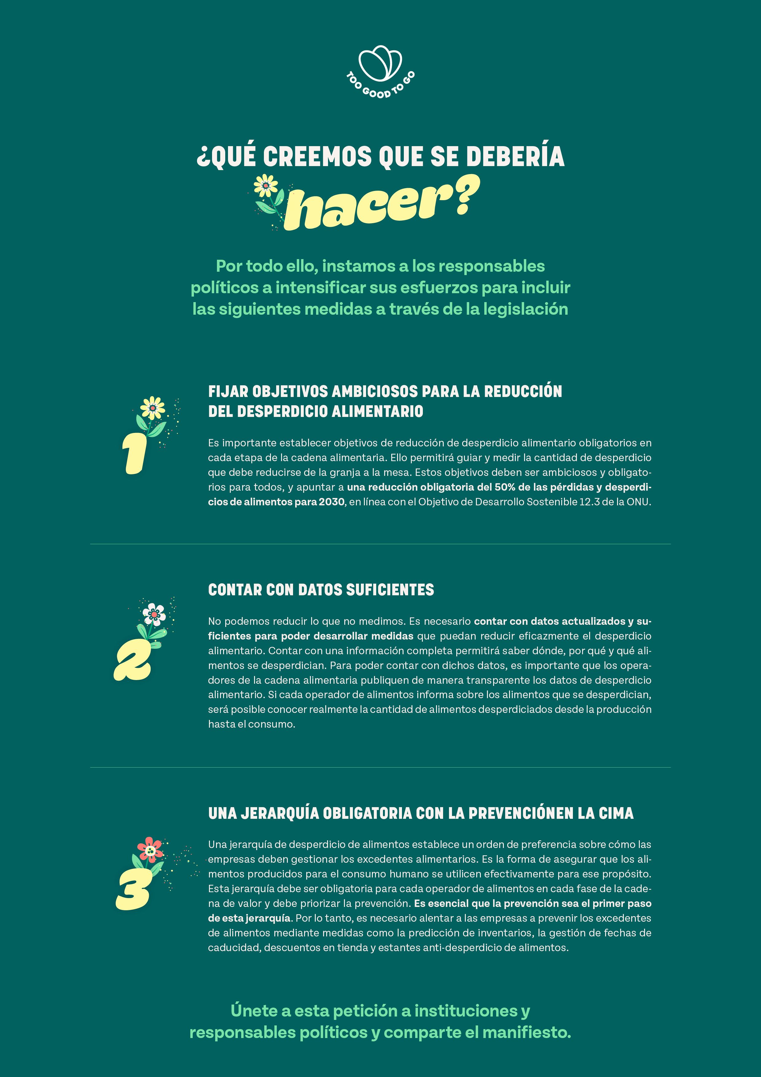 Es por ello que, en el marco de la Semana Sin Desperdicio de Alimentos, desde Too Good To Go lanzamos este manifiesto en el que pedimos que la adopción de medidas contra el desperdicio alimentario sea una prioridad en la agenda política y regulatoria de nuestro país en los próximos años.