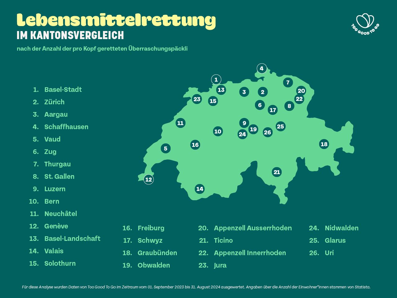 … Basel-Stadt. Too Good To Go hat sich die Daten der geretteten Überraschungspäckli seit dem letzten IDAFLW 2023 angeschaut und anhand der Einwohner*innenzahl der jeweiligen Kantone errechnet, welche Kantonsbewohner*innen die grössten Lebensmittelretter*innen sind. Basel-Stadt sichert sich zum zweiten Mal den obersten Podestplatz. Auch die Zürcher*innen können ihre Podestplatzierung als Zweite halten. Für eine Überraschung sorgte der Aargau, die sich innerhalb eines Jahres von Platz 12 auf den dritten Platz gekämpft hat. Aufholbedarf gibt es nach wie vor in den Zentralschweizer Kantonen Uri, Glarus und Nidwalden, die zum zweiten Mal in Folge die letzten Plätze im Kantons-Ranking belegen.