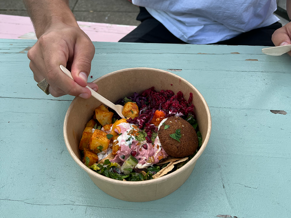 Den dritten Spot, den wir dir vorstellen möchten, ist die Hummus Bar. Ihre Überraschungstüten sind heiß begehrt – und das aus gutem Grund! Die Bowl mit Falafel, verschiedenem Gemüse und natürlich Hummus ist nicht nur fürs Auge ein Genuss. Abends ab 20.30 Uhr abgeholt, eignet sich die Bowl super als preiswerter Lunch für den nächsten Tag.