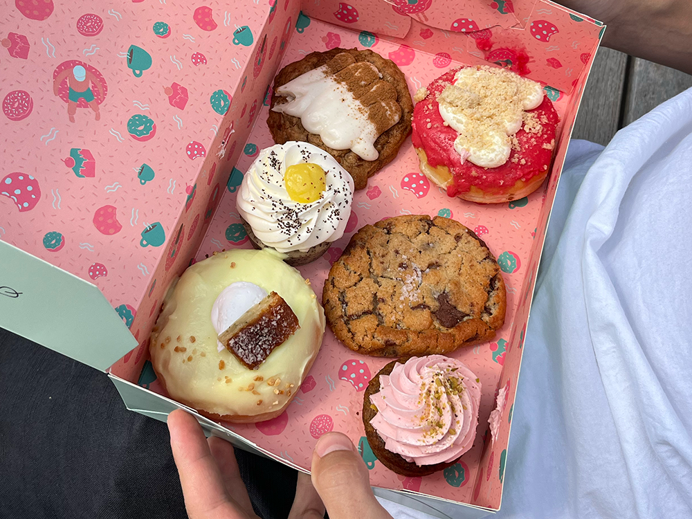 Weiter geht's mit Kjeks, denn hier kann man sich fast nicht sattsehen! Die Donuts, Törtchen und Kekse sehen einfach unwiderstehlich aus. Und wie Kris und Felix später herausgefunden haben, schmecken die Leckereien auch genau so gut! Diese Überraschungstüte mit veganen Optionen ist ideal zum Teilen – mit Kolleg*innen, Familie oder einfach mit dir selbst...