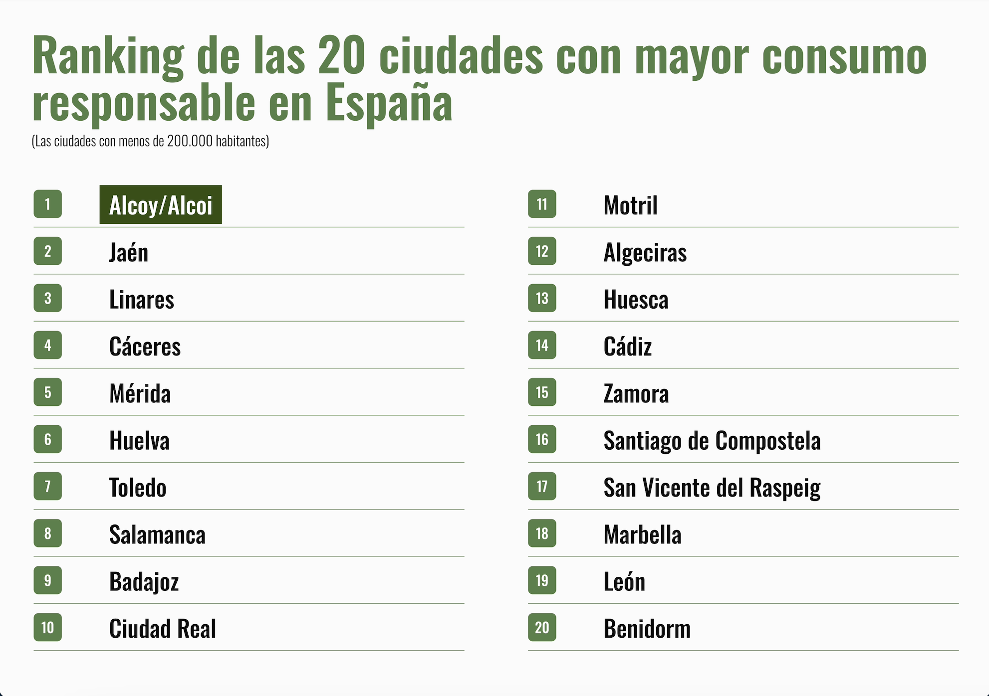📢 Dato curioso: Ciudades como Madrid y Barcelona han descendido posiciones en el ranking respecto al año pasado, lo que refleja la necesidad de impulsar aún más el consumo responsable en las grandes urbes.