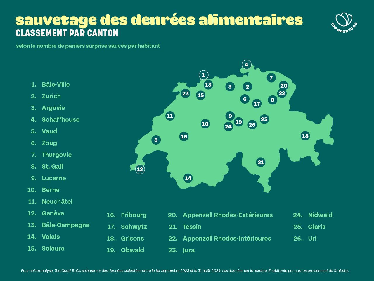 ... Bâle-Ville. Too Good To Go a examiné les données relatives au nombre de paniers surprise sauvés depuis le dernier IDAFLW en 2023 et a calculé, sur la base du nombre d'habitant.es de chaque canton, quels sont ceux qui ont sauvé le plus de denrées alimentaires. Bâle-Ville s'assure pour la deuxième fois la plus haute place du podium. Les Zurichoises et Zurichois peuvent également conserver leur deuxième place, suivis par les Argoviens, qui ont réussi à passer de la 12e à la 3e place en l'espace d'un an.