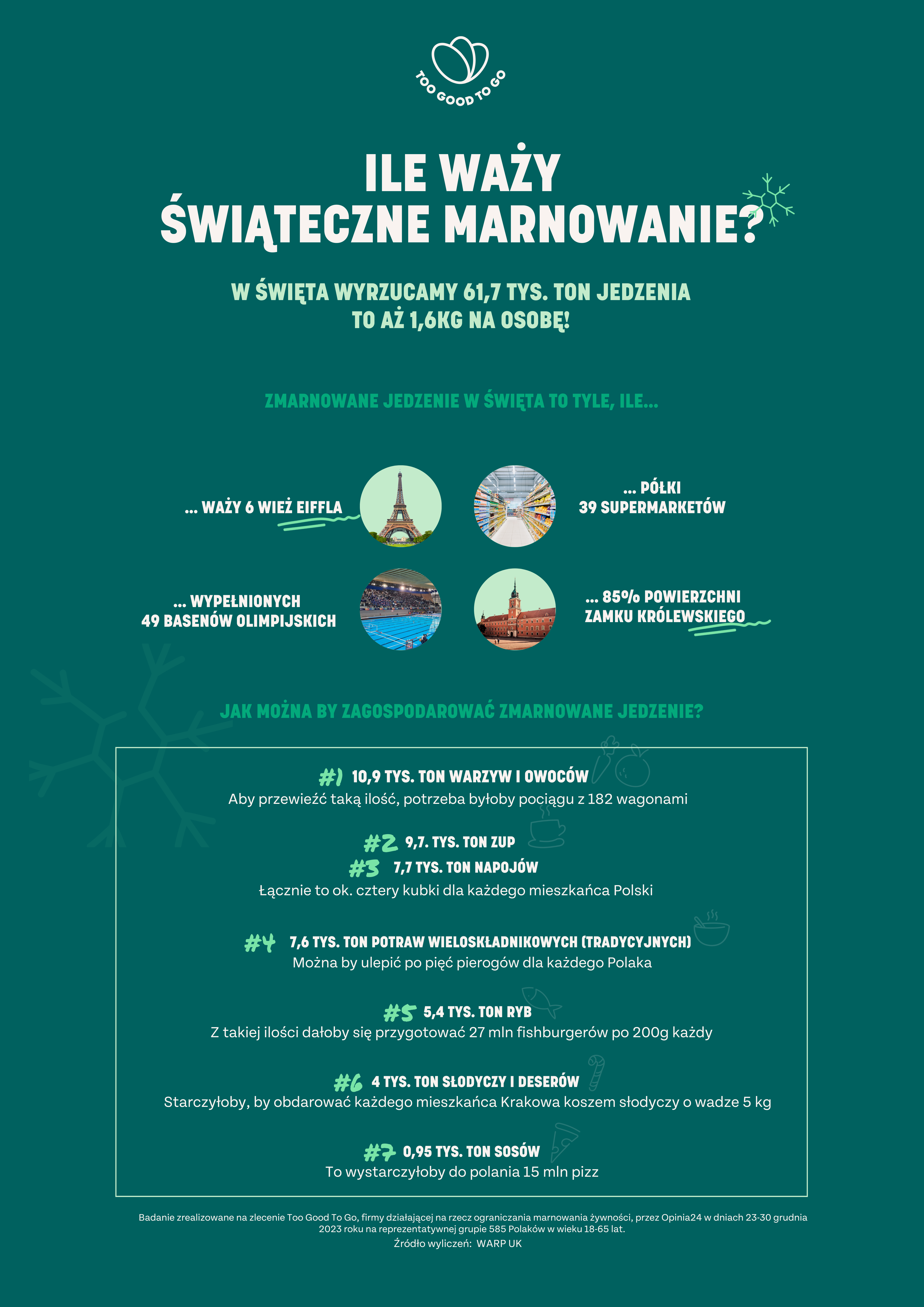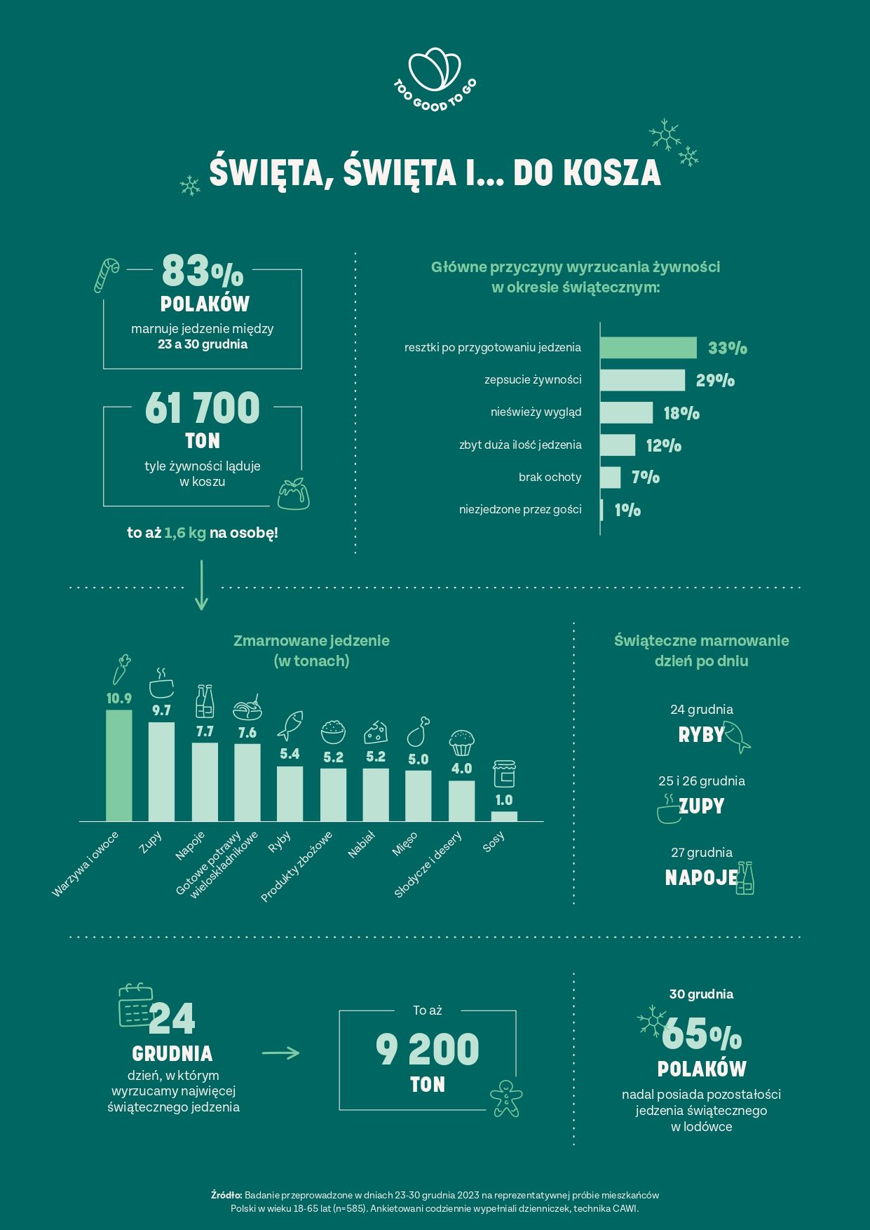 Z badań przeprowadzonych przez firmę wpływu społecznego Too Good To Go wynika, że aż 83% Polaków wyrzuca świąteczne jedzenie między 23 a 30 grudnia. W tym okresie do koszy trafia aż 61,7 tys. ton, czyli 1,6 kg na osobę. Resztki zmarnowanego jedzenia mogłyby zapełnić półki 39 supermarketów lub wypełnić 49 basenów olimpijskich. A to nie koniec obrazujących skalę problemu przykładów.